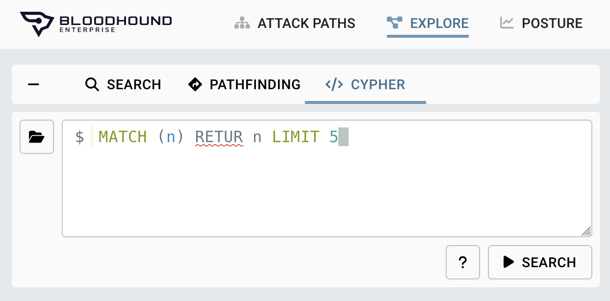 • Cypher syntax highlighting and autocomplete - Writing Cypher got significantly easier with syntax highlighting and autocomplete support. While typing a Cypher query, the editor will now display options to auto-complete in-progress words based on the BloodHound schema and highlight issues directly within the editor.